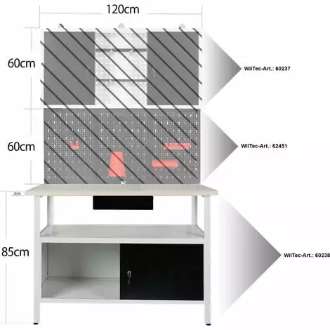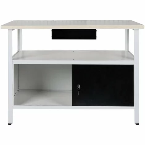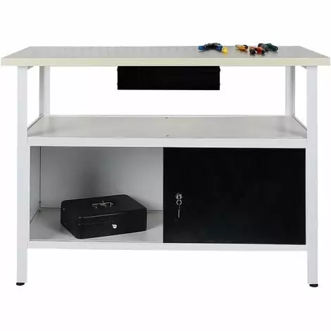 Une table d’atelier pratique et stable. L’armoire inférieure est en acier revêtu de poudre, le plan de travail est une plaque en MDF solide. Directement sous la table de travail se trouve un tiroir extractible. L’armoire inférieure est munie d’un compartiment avec une porte, qui se ferme ainsi que d’un compartiment de rangement ouvert. En dessus des deux compartiments, se trouve une grande surface de rangement. Ainsi, cette table à outils offre assez de place de stockage ainsi que la possibilité d’enfermer des outils précieux.