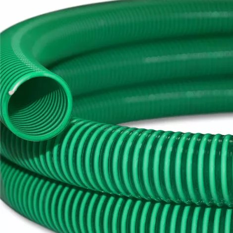 En utilisation pour les bassins, le plastique vert est presque invisible pour l’observateur. La pression max. autorisée est 1 bar, la spirale de renforcement empêche que le tuyau ne se plie dans les coins. A l’intérieur le tuyau est presque lisse, à l’extérieur il est légèrement côtelé.