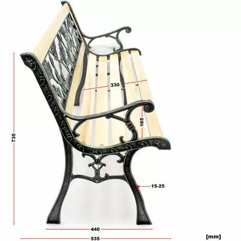 | Application / Information / Caractéristiques | Dossier Intérieur en motif de roses Bras en fer de fonte massif Dossier intérieur en plastique Lattes en bois robuste et laqué |