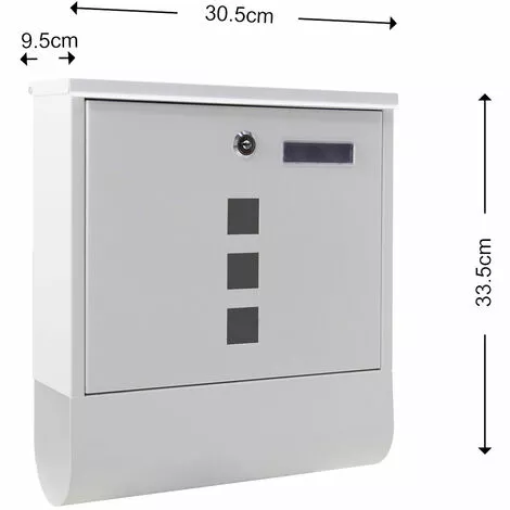 | Dimensions | Boite aux lettres: 30,5 x 9,6 x 33,5 cm Compartiment intérieur ( dimensions): 29,8 x 23 x 7 cm Dimensions de la fente: 29,8 x 3 cm Compartiment pour journaux: 30 x 8,3 x 9 cm Porte- étiquette: 6,5 x 1,5 cm Distance entre les trous de fixatio: 17 x 16,8 cm Taille des trous de fixation: ∅ 5 mm |