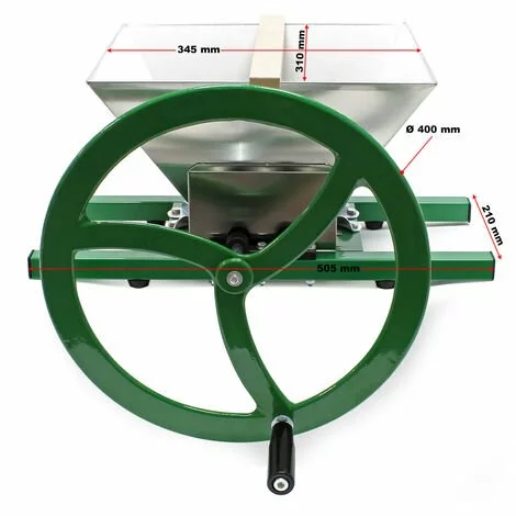 Le broyeur de fruits a les dimensions suivantes : 57,5 cm x 48,5 cm x 25,5 cm et n‘est, donc, pas très encombrant. Le poids de l’appareil robuste est de 10 kg environ, vous pouvez donc le transporter facilement. L’entonnoir avec broyeur est monté sur une structure de base en bois, celle-ci peut être installée sur un sceau, sur un bac ou bien sur d’autres récipients collecteurs.
