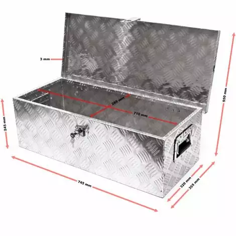 La malle est soudée à la main et tous les bords sont soigneusement sertis afin d’éviter la formation de bords tranchants qui pourraient provoquer des blessures. La caisse se ferme avec un couvercle à charnière, de sorte à ce que celui-ci ne risque jamais de s’ouvrir pendant le transport. Des poignées latérales facilitent le transport de la malle, qui devrait être effectué à deux, si vous deviez porter une lourde charge. En somme, le boitier en aluminium est d’utilisation polyvalente pour les besoins des chantiers de construction, pour le matériel d’agriculture, les instruments de musique, les besoins d’extérieur et bien plus encore.