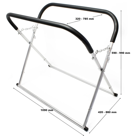 Le tréteau de montage a les dimensions suivantes: 105 x 80 x 100 cm; le support se règle en hauteur. Les hauteurs de travail peuvent être ajustées selon votre besoin individuel entre 80 et 100 cm, au moyen de chaînes.