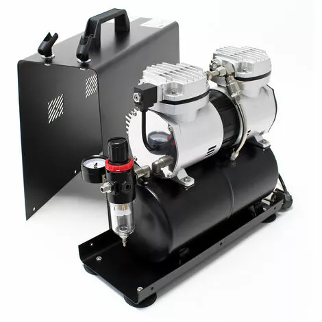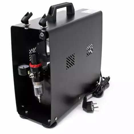 La solution intelligente: l’appareil idéal et très perfomant pour tous les travaux de pulvérisation que ce soit pour débutants ou pour professionnels, à utiliser dans le modélisme, la céramique, la poterie, la cosmétique, les salons de manucure, les casques, les reproductions techniques, le tanning, le tatouage, le textile, les studios Nail-Art, les travaux de peinture à eau, ou pour simple pulvérisation. De poids léger et facile à transporter. Très silencieux avec 45 décibels seulement. Le compresseur est totalement automatique et pratiquement sans vibrations. Il fonctionne sans huile et donc sans air pollué. Avec filtre à eau, régulateur d’air comprimé et manomètre.