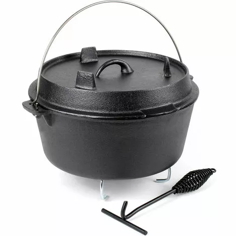 Une marmite Dutsch Oven en fonte avec couvercle assorti représente l’ustensile parfait pour la cuisine en plein air. Que ce soit sur un foyer permanent, un feu de camp ou un espace barbecue, la marmite d’une capacité de 12 litres vous permet d’étendre la préparation des aliments en plein air au-delà du barbecue normal. Pour un support sûr, le faittout Dutch Oven est doté de pieds afin qu’il tienne également de manière stable sur des surfaces inégales.