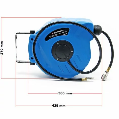 L’enrouleur de tuyau d’air comprimé est équipé d’un raccord rapide d’un ¼ de pouce (6,35 mm). La pression du tuyau est de 8 bars. La pression d’éclatement est de 12 bars. Le robuste enrouleur de tuyau est fabriqué en polypropylène et est résistant aux UV.