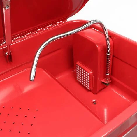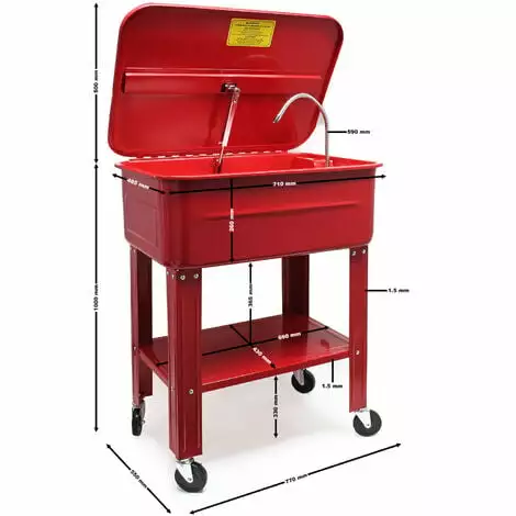 Grâce à sa taille compacte, cet appareil robuste s’adapte parfaitement à l’utilisation mobile, surtout donc dans les garages et ateliers. Avec une capacité de 75,7 litres, l’appareil est assez spacieux pour y laver professionnellement des outils de toutes sortes. L‘appareil est muni de roues pour un déplacement facile. Le plateau inférieur sert à y placer les objets fraîchement nettoyés, pour qu‘ils puissent sécher. Vous pouvez, dans le cas échéant, séparer en toute facilité, le bac de la sous-structure. La fontaine se compose, entre autres, d’une base amovible ainsi que d’un bac qui en rendent l’usage flexible et indispensable.