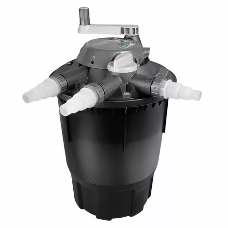 Le nouveau Bioforce Revolution est un filtre bassin à pression hautement développé muni d’un clarificateur UV et d’un unique système de nettoyage facilement utilisable, générant de l’eau pure et assurant un milieu sain dans votre étang. Tournez tout simplement la manivelle pour mettre les pales de nettoyage en mouvement qui séparent les particules de saleté des cubes en mousse CypriCube. Les bactéries utiles resteront ainsi dans l’eau d’étang pendant le nettoyage du filtre.