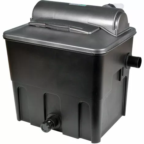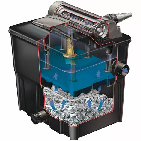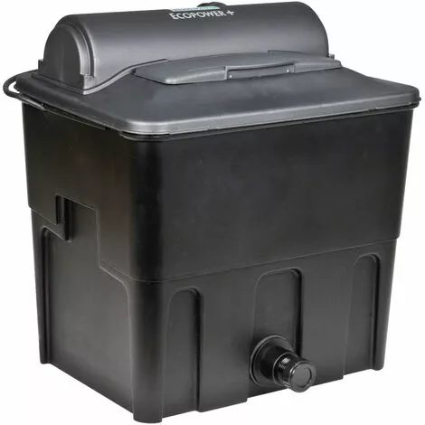 Facile à nettoyer et à maintenir un flux avec haut-bassin UVC filtre nettoyant. Ce filtre peut au bord de l’étang ou dans la partie supérieure d’un cours de cascade ou un ruisseau. Il traverse la pompe saleté est appelée pour un excellent premier nettoyage dans le coussinet de mousse maille fine par le bas du filtre et l’eau filtrée à la biomedia. L’Ecopower plus la série comporte l’unique biomedia Kaldnes permettant une surface très grand attachement et un changement continu des bactéries. Ces bactéries sont nécessaires pour les particules de saleté nuisible à décomposer et convertir les documents utiles pour l’étang. L’UVC intégré filtre dispose d’une lampe de 12 Watt UV pour « eau verte », en raison de zweefalg. Le résultat est un excellent effet de nettoyage et pas seulement un brillant, mais aussi un étang très sain. Ce filtre convient aux bassins avec un contenu jusqu’à 12000 litres sans poissons ou 6000 litres y compris poissons. en utilisant les raccordements de tuyau fourni vous pouvez facilement créer un étang tuyau avec diamètre de tuyau de Ø 20/25/32 ou 40 mm sur le filtre. Sur tous les modèles Ecopower Plus est une garantie de 3 ans d’application