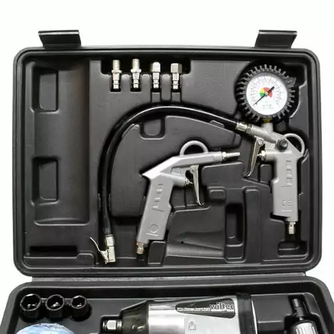 | Accessoires | 1 x Pistolet à air comprimé avec jauge de remplissage 1 x Soufflette 1 x Clé à chocs pneumatique ½ 1 x Meuleuse avec pince de serrage ¼ 1 x Tuyau d’air comprimé (5 m x 5 mm x 8 mm) 1 x Pince de serrage 5 x Meule montée 6mm(¼”) 5 x Meule montée 3 mm (⅛”) 3 x Douille (14 mm | 17 mm | 19 mm) 1 x Raccord rapide 4 x Raccord rapide pour le raccordement à l’air 2 x Clé de serrage 1 x Coffret en plastique |