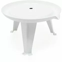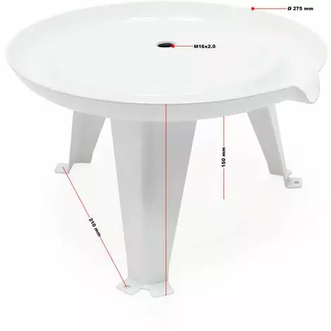 Un support en fonte robuste peint en blanc et ayant un diamètre de 275 mm. La hauteur est de 150 mm et l’espacement des trous des pieds est de 210 mm. Le support convient pour une broche de M16x2.0.