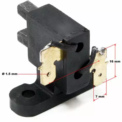 Adapté aux alternateurs synchrones de la série KT (KT3, KT5, KT6), aux générateurs KTS10 / KTS12 montés d’un côté et aux générateurs de même construction. Le raccordement électrique des porte-balais se fait via des contacts par fiche plate de 6,35 mm. Les porte-balais se trouvent dans beaucoup de générateurs de courant habituels avec régulation AVR (régulation automatique de courant) ; dans la plupart des cas, il s’agit de générateurs 3-phasiques (400 V) dans lesquels sont intégrés des porte-balais (balais de carbone).