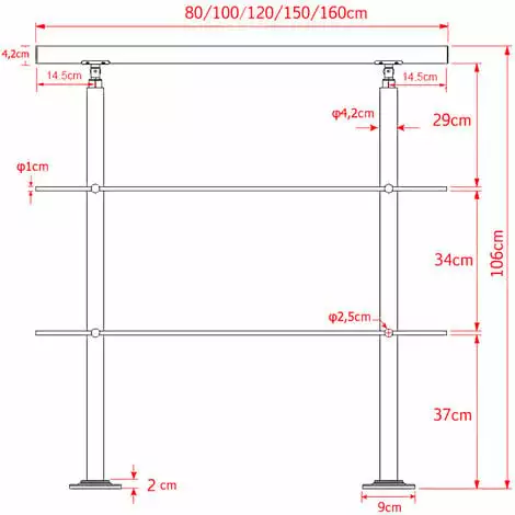 | Dimensions | Longueur: 180 cm Hauteur: 106 cm Main courante Ø: 42 mm Traversières Ø 10 mm Distance des supports de sol: 151 cm Hauteur du support de sol: 102,5 cm Dispositifs de fixation |