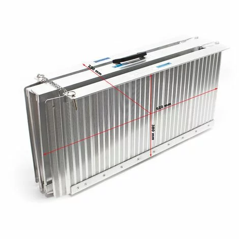 La rampe peut être facilement pliée dans le sens der la longueur grâce à une poignée et portée facilement par un propre poids de 10,5 kg seulement . La rampe dispose d’une capacité de charge de 270 kg. Grâce à son maniabilité facile et domaine d’utilisation flexible , cette rampe vous convaincra très rapidement.