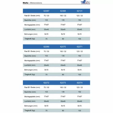 Le diamètre de la roue est de 75 mm. La plaque robuste qui surplombe la roue de 77 x 67 mm, se visse simplement sur la charge qui doit être transportée, au moyen des orifices préfabriqués.