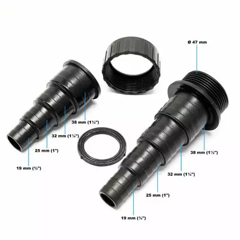 Il s’agit d’un raccord de tuyau pour par exemple les tuyaux de piscine, allant de 3/4″ (19 mm) à 1 1/2″ (38 mm).