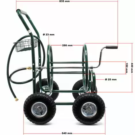 Avec le chariot de tuyau à manivelle mobile, vous pourrez atteindre chaque endroit de votre jardin, même si le robinet est assez loin. Il suffit de connecter le tuyau d’amenée d’eau fourni et long d’environ 2 mètres sur la conduite et de brancher après votre tuyau d’arrosage sur le dévidoir mobile. Maintenant, le chariot de tuyau d’arrosage se pousse sur site grâce aux quatre roues/pneus robustes et à la poignée ergonomique. Les grandes roues d’un diamètre de 25 cm environ conviennent même pour les surfaces âpres, et c’est grâce à cette propriété que vous êtes libre dans vos mouvements et pouvez utiliser le chariot facilement sur tous les terrains.