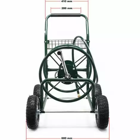 Le porte-tuyau compact inoxydable, qui mesure 81 × 58 × 92 cm (Lo×La×Ha), se compose d’un cadre en acier robuste et est enduit d’une peinture en poudre anti-corrosif. Ce dévidoir de tuyau stable peut donc s’assembler et se désassembler facilement. Le panier utile fixé à la poignée est un extra particulier qui vous permet de déposer les outils et d’autres équipements.